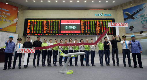진에어는 이날 오전 서울 여의도 한국거래소 홍보관에서 최정호 진에어 대표이사, 이은태 한국거래소 유가증권시장본부장, 조웅기 미래에셋대우 대표, 김정운 한국상장회사협의회 부회장, 이호철 IR 협의회 회장 등이 참석한 가운데 상장식을 가졌다.