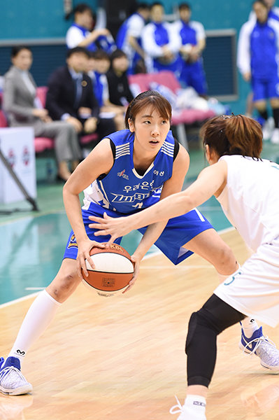 우리은행 박혜진이 10일 부천체육관에서 열린 KEB하나은행과의 여자프로농구 원정경기에서 상대 수비를 제치고 있다. 14점을 올린 박혜진의 활약 속에 5연승을 달린 우리은행은 시즌 첫 단독 선두로 올라섰다. 사진제공 | WKBL
