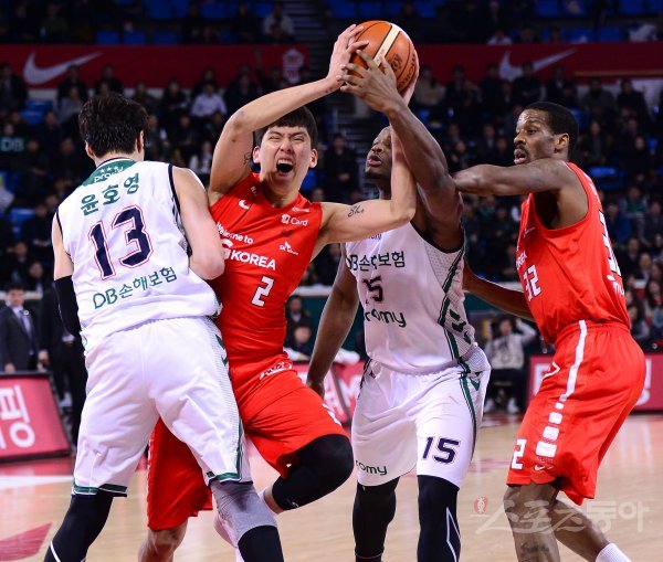 12일 잠실학생체육관에서 열린 ‘2017-2018 정관장 프로농구’ 원주 DB와 서울 SK 경기에서 SK 최준용이 DB의 수비를 뚫고 골밑을 공격하고 있다.