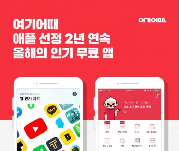 애플은 매년 앱스토어에서 대중의 인기를 얻은 앱 서비스를 발표한다. 기준은 앱스토어 설치 수, 리뷰 등 성과를 종합적으로 집계한다. 올해의 인기 무료 앱은 여기어때 외 유튜브, 카카오뱅크, 인스타그램, 파파고 등 대중의 사랑을 얻은 앱 20여개가 포함됐다. 스타트업 기업 서비스로는 여기어때, 배달의 민족, 몰디브가 포함됐다. 신철호 여기어때 CMO는 “애플로부터 인기 앱으로 인정돼 기쁘다. 사용자 만족을 극대화할 수 있는 혁신 주도 서비스가 되도록 할 것”이라고 했다.