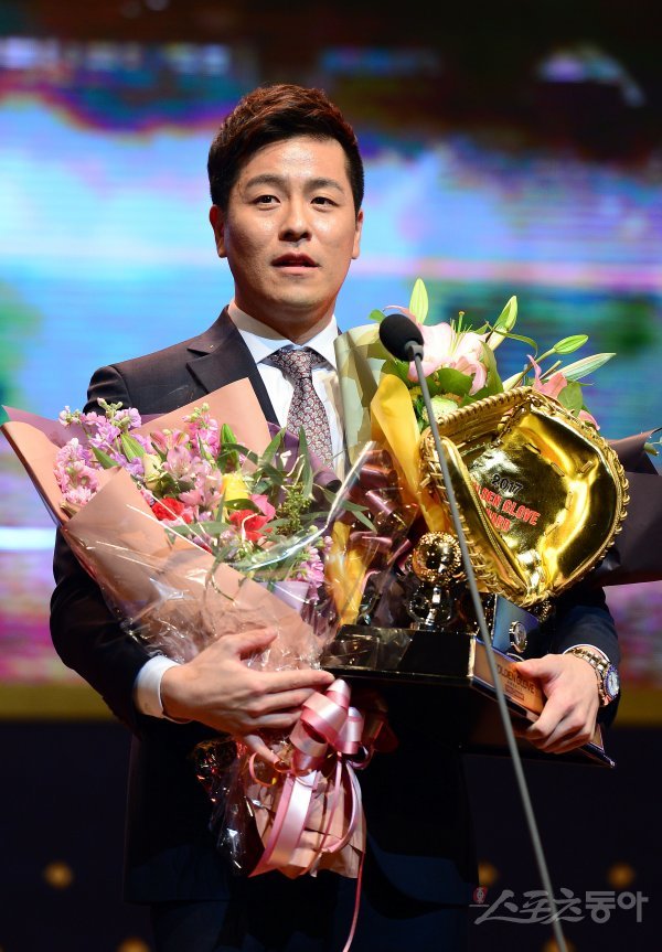 ‘2017 타이어뱅크 KBO 골든글러브 시상식’이 13일 서울 강남구 코엑스 오디토리움에서 열렸다. 포수 부문 골든글러브를 수상한 삼성 강민호가 소감을 말하고 있다.