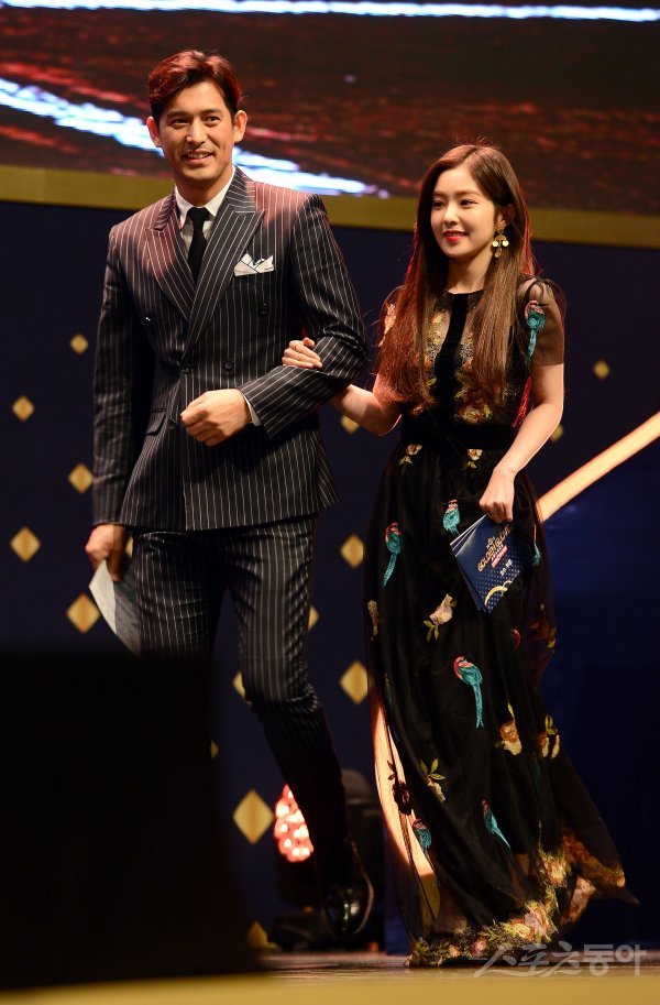 ‘2017 타이어뱅크 KBO 골든글러브 시상식’이 13일 서울 강남구 코엑스 오디토리움에서 열렸다. 배우 오지호와 레드벨벳 아이린이 투수 부문 골든글러브 수상자를 발표를 위해 단상으로 나오고 있다.