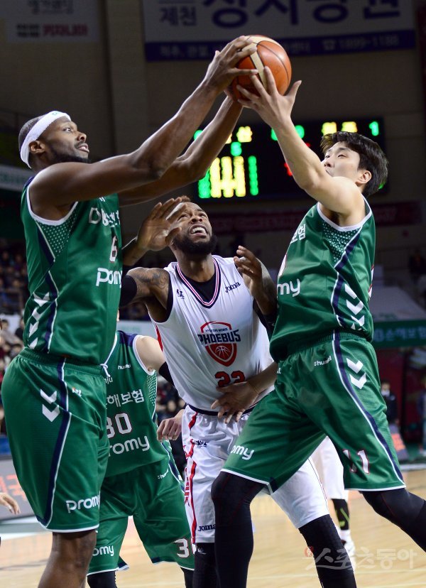 17일 원주종합체육관에서 열린 ‘2017-2018 정관장 프로농구’ 울산현대모비스와 원주DB 경기에서 DB 벤슨과 유성호가 현대모비스 블레이클리에 앞서 리바운드볼을 잡고 있다.