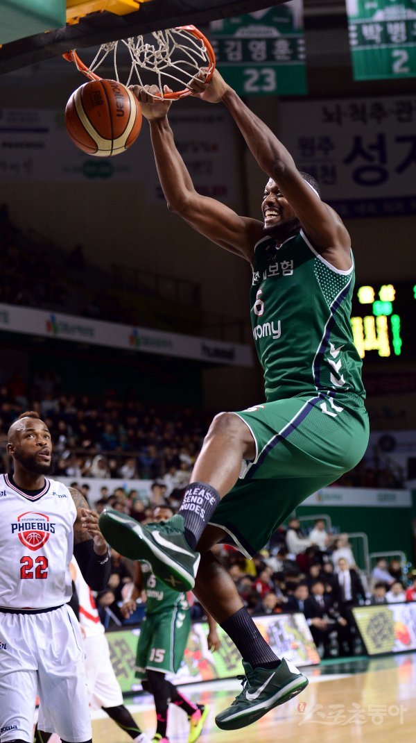 17일 원주종합체육관에서 열린 ‘2017-2018 정관장 프로농구’ 울산현대모비스와 원주DB 경기에서 DB 벤슨이 투핸드 덩크슛을 성공시키고 있다.
