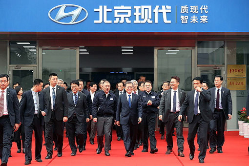 문재인 대통령은 이날 충칭에 있는 ‘베이징현대’ 5공장을 방문했다. 문 대통령의 충칭 현대 공장 방문에는 정의선 현대차 부회장이 직접 안내를 맡았다. 정의선 부회장은 문 대통령에게 중국 내 판매 회복을 위한 현대차의 노력을 상세하게 설명했다.