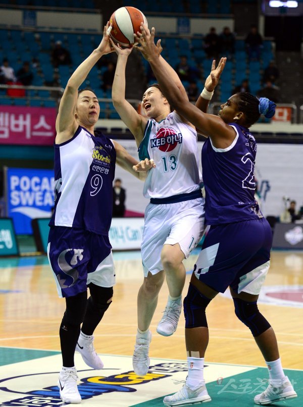 18일 경기도 부천실내체육관에서 열린 ‘신한은행 2017-2018 여자프로농구’ 부천 KEB하나은행과 인천 신한은행의 경기에서 KEB하나은행 김단비가 신한은행 곽주영, 그레이의 수비를 피해 슛을 쏘고 있다.