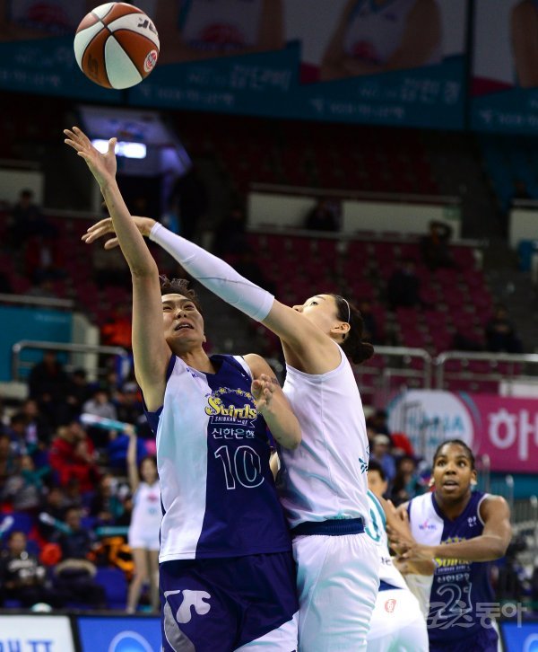 18일 경기도 부천실내체육관에서 열린 ‘신한은행 2017-2018 여자프로농구’ 부천 KEB하나은행과 인천 신한은행의 경기에서 신한은행 유승희가 KEB하나은행 강이슬의 수비를 제치며 슛을 쏘고 있다.