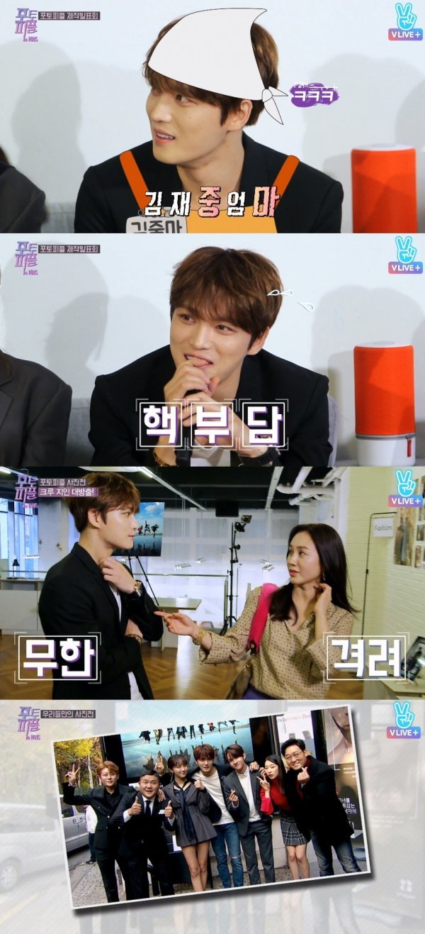 18일 오후 포털사이트 네이버 V앱을 통해 첫 공개된 웹예능 \'포토피플\'에서 화기애애했던 제작발표회 현장을 공개했다. 김재중은 오랜만에 예능에 출연하게 된 소감을 묻는 질문에 "8년 만에 예능에 출연했다"며 "편한 사람들과 함께 해서 좋았다. 예능에 대한 부담감보다는 사진에 대한 부담감이 컸다"고 말했다.