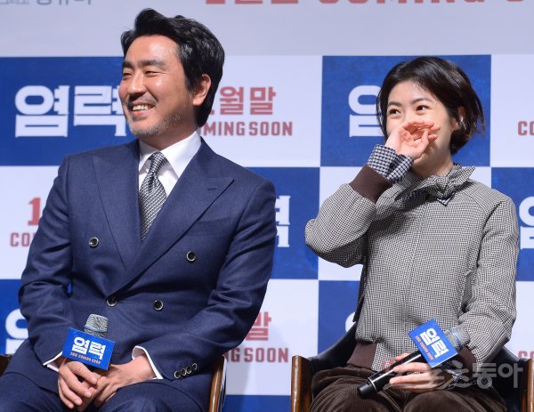 배우 류승룡과 심은경(오른쪽)이 19일 서울 강남구 압구정로에 위치한 CGV 압구정에서 열린 영화 ‘염력’ 제작보고회에서 미소를 짓고 있다.