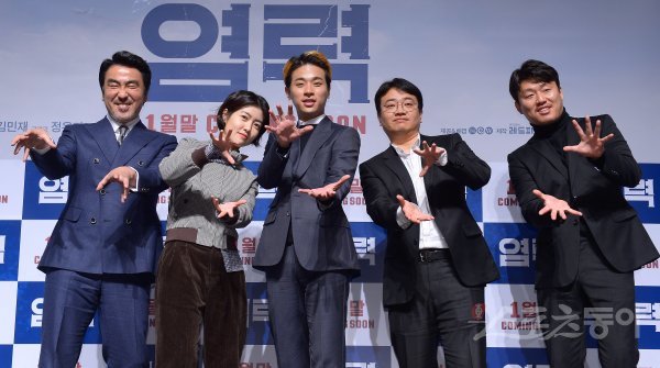 배우 류승룡과 심은경, 박정민, 연상호 감독, 김민재(왼쪽부터)가 19일 서울 강남구 압구정로에 위치한 CGV 압구정에서 열린 영화 ‘염력’ 제작보고회에서 포즈를 취하고 있다.