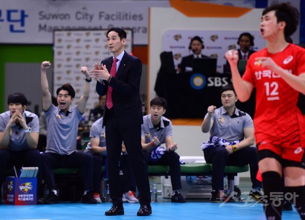 19일 수원실내체육관에서 ‘2017-2018 도드람 V리그’ 수원 한국전력과 의정부 KB손해보험의 경기가 열렸다. 한국전력 김철수 감독이 선수들의 플레이에 박수를 보내고 있다.