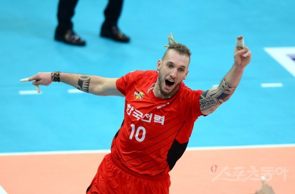 19일 수원실내체육관에서 ‘2017-2018 도드람 V리그’ 수원 한국전력과 의정부 KB손해보험의 경기가 열렸다. 한국전력 펠리페가 블로킹 득점으로 트리플 크라운을 달성한 뒤 포효하고 있다.