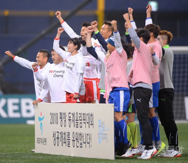 19일 서울 구로구 고척스카이돔에서 홍명보 자선축구 경기 ‘KEB하나은행과 함께하는 2017 셰어 더 드림 풋볼 매치(Share The Dream Football Match)가 열렸다. 하프타임 때 펼쳐진 계주 경기가 끝난 후 선수들이 평창 동계올림픽 성공 개최를 위한 포토타임을 갖고 있다.