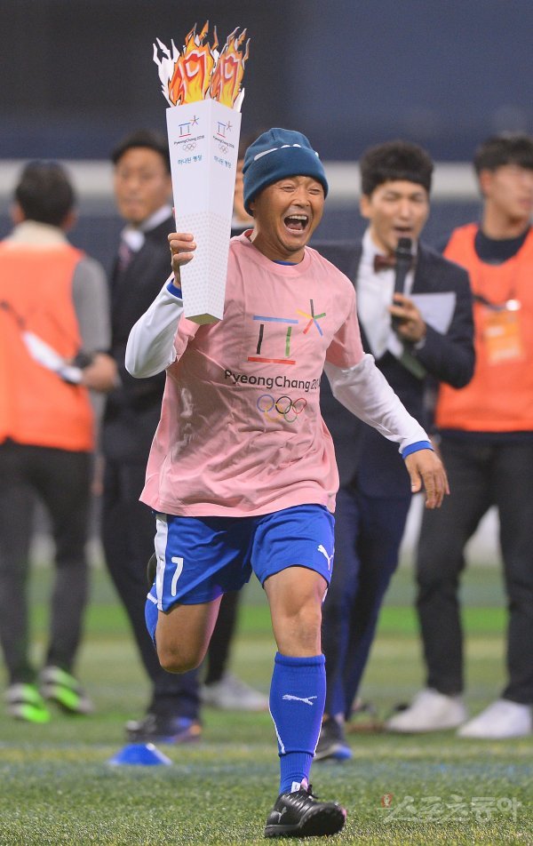 19일 서울 구로구 고척스카이돔에서 홍명보 자선축구 경기 ‘KEB하나은행과 함께하는 2017 셰어 더 드림 풋볼 매치(Share The Dream Football Match)가 열렸다. 하프타임 때 펼쳐진 계주 경기에서 희망팀 이봉주가 성화를 들고 웃으며 달리고 있다.