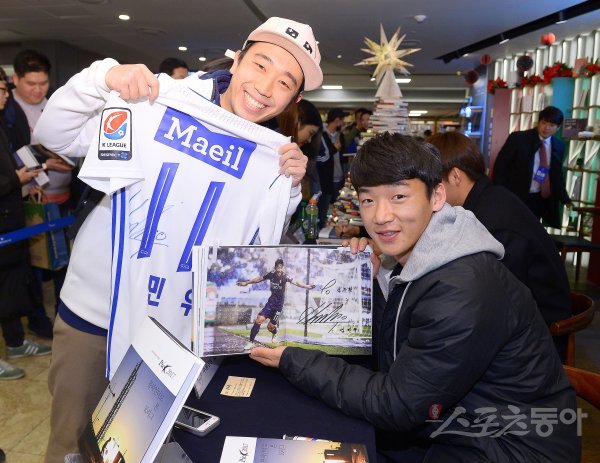 22일 서울 광화문 교보문고에서 ‘2017 K리그 사진집’ 발간 기념 팬 사인회가 열렸다. 수원삼성 김민우가 남성팬과 카메라를 향해 포즈를 취하고 있다.