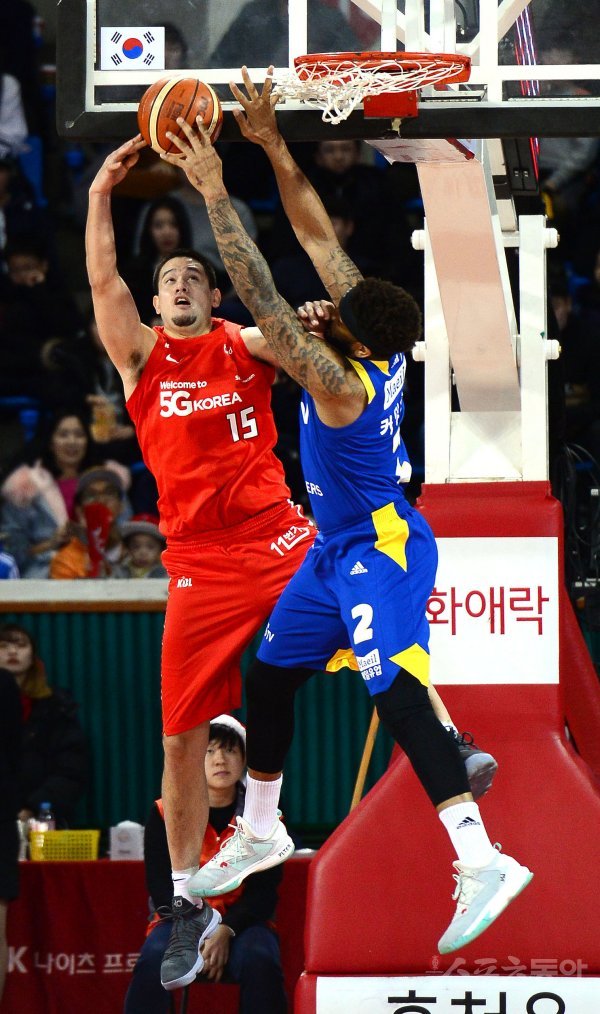 25일 서울 잠실학생체육관에서 열린 ‘2017-2018 정관장 프로농구’ 서울삼성과 서울SK 경기에서 삼성 커밍스가 SK 김민수의 골밑슛을 블록으로 막아내고 있다.
