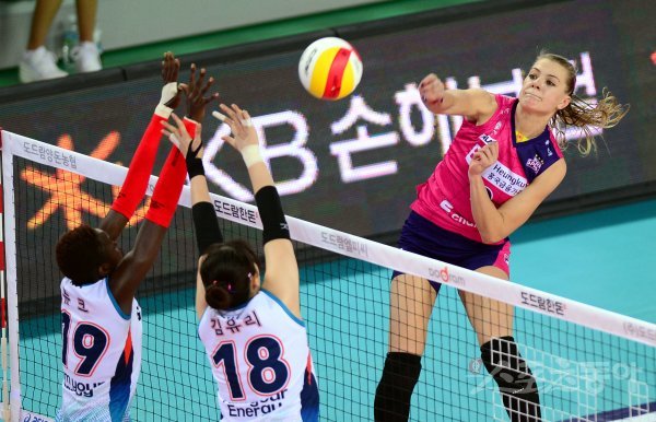 25일 인천 계양체육관에서 ‘2017-2018 도드람 V리그’ 인천 흥국생명과 서울 GS칼텍스의 경기가 열렸다. 흥국생명 크리스티나가 GS칼텍스 블로커를 피해 스파이크를 날리고 있다.