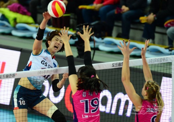 25일 인천 계양체육관에서 ‘2017-2018 도드람 V리그’ 인천 흥국생명과 서울 GS칼텍스의 경기가 열렸다. GS칼텍스 강소휘가 흥국생명 블로커를 피해 스파이크를 날리고 있다. 인천 | 김민성 기자 marineboy@donga.com
