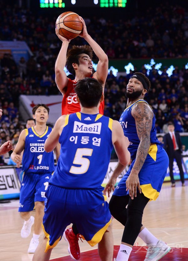 25일 서울 잠실학생체육관에서 열린 ‘2017-2018 정관장 프로농구’ 서울삼성과 서울SK 경기에서 SK 정재홍이 삼성의 수비에 막혀 패스를 시도하고 있다.