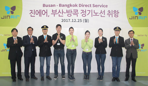 진에어는 25일 김해국제공항 국제선 청사 2층에서 고광호 진에어 영업본부장을 비롯한 부산지점 진에어 임직원들이 참석한 가운데 부산-방콕 노선과 부산-삿포로 노선 신규 취항식을 진행했다. 진에어는 이로서 기타큐슈, 괌, 다낭, 세부, 오사카, 오키나와, 클락 등 총 10개의 부산발 국제선을 운영하게 됐다.