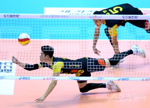 26일 의정부실내체육관에서 열린 ‘2017-18 도드람 V리그’ 남자부 한국전력과 KB손해보험 경기에서 OK저축은행 이시몬이 몸을 날려 리시브 하고 있다.