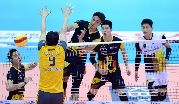 26일 의정부실내체육관에서 열린 ‘2017-18 도드람 V리그’ 남자부 한국전력과 KB손해보험 경기에서 OK저축은행 김정훈이 KB손해보험의 블로킹 사이로 스파이크 공격을 하고 있다.
