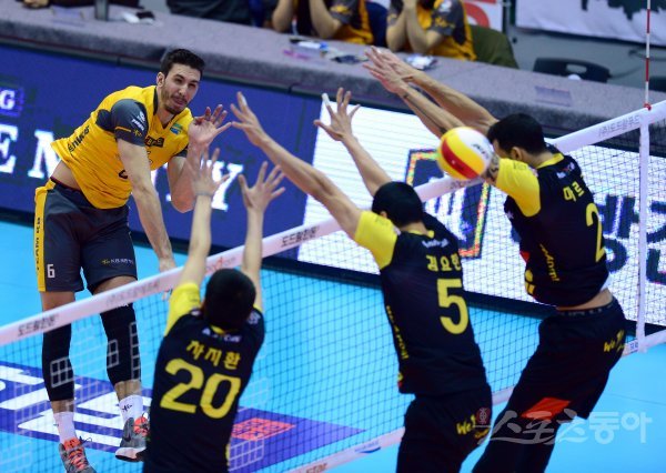 26일 의정부실내체육관에서 열린 ‘2017-18 도드람 V리그’ 남자부 한국전력과 KB손해보험 경기에서 KB손해보험 알렉스가 OK저축은행의 블로킹 사이로 스파이크 공격을 하고 있다.
