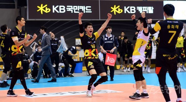 26일 의정부실내체육관에서 열린 ‘2017-18 도드람 V리그’ 남자부 한국전력과 KB손해보험 경기에서 OK저축은행 선수들이 세트스코어 3-1 승리를 거둔 후 환호하고 있다.