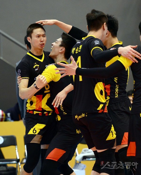 26일 의정부실내체육관에서 열린 ‘2017-18 도드람 V리그’ 남자부 한국전력과 KB손해보험 경기에서 OK저축은행 이민규가 4세트 결정적인 블로킹 득점에 성공한 후 환호하고 있다.