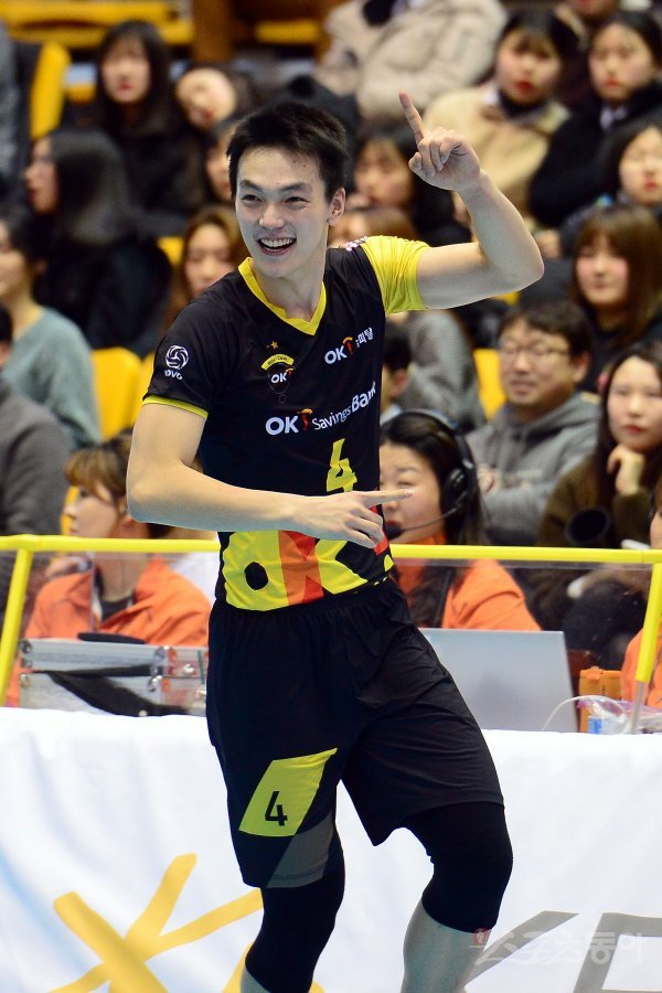 26일 의정부실내체육관에서 열린 ‘2017-18 도드람 V리그’ 남자부 한국전력과 KB손해보험 경기에서 OK저축은행 조재성이 서브 득점에 성공한 후 환호하고 있다.