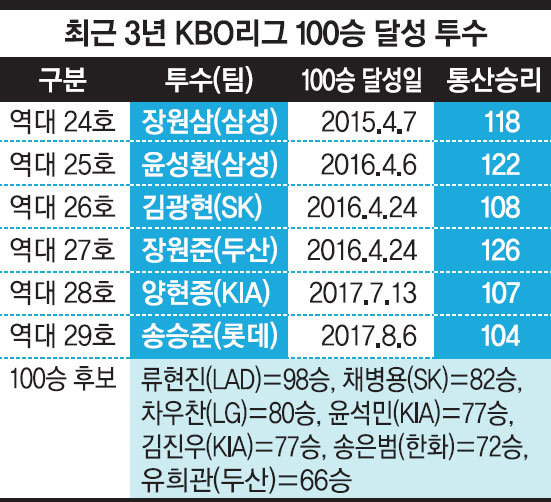 최근엔 100승 투수가 자주 나왔다. 2015년 장원삼이 역대 24번째 100승 고지를 밟았고, 2016년엔 삼성 윤성환과 SK 김광현, 두산 장원준 등 3명이 한꺼번에 100승을 돌파했다. 그리고 올해는 KIA 양현종과 롯데 송승준 2명이 100승 클럽에 가입했다. 양현종은 7월 13일 광주 NC전에서 승리하며 역대 28번째이자 좌완투수로는 역대 5번째 100승 고지를 밟았다. 이어 송승준이 8월 6일 사직 넥센전에 승수를 추가하며 역대 29번째 100승 훈장을 달았다. 둘 다 큰 의미를 뒀다. 100승 달성 순간 양현종은 “1승씩 차곡차곡 쌓다보니 여기까지 왔다”면서 “타이거즈 좌완 최초라는 타이틀이 기분 좋다”고 말했고, 송승준 역시 “해외파 특별지명을 통해 늦게 KBO리그에 왔는데 그동안 몸 관리를 잘 해왔다는 생각이 든다”며 감격스러워했다.