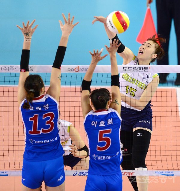 27일 김천실내체육관에서 열린 ‘2017-18 도드람 V리그’ 여자부 현대건설과 한국도로공사 경기에서 현대건설 황민경이 도로공사의 블로킹 사이로 스파이크 공격을 하고 있다.