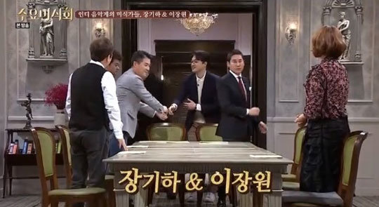 27일 밤 방송된 tvN \'수요미식회\'에서는 장기하와 이장원이 출연했다. 이날 신동엽은 "뇌뿐만이 아니라 혀 돌기 감각까지 예민하신 혀섹남이다"라며 장기하와 이장원을 소개해 웃음을 자아냈고, 전현무는 "인디 음악계의 알아주는 뮤지션인 건 알았지만 두 분이 친한 지는 몰랐다. 원래 되게 친한 사이라고 하시던데"라고 물었다.