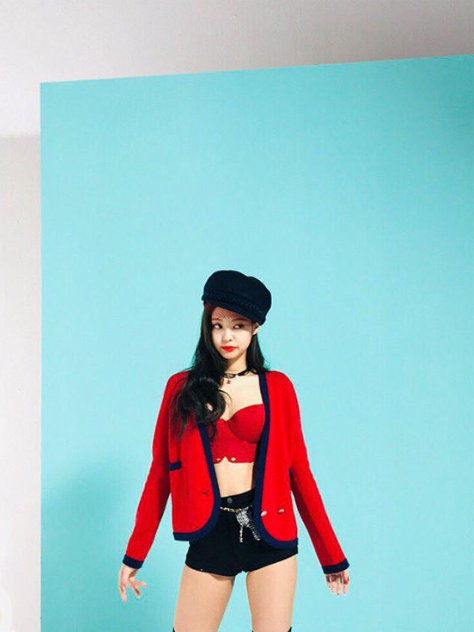 공개된 사진 속 제니는 세트장에서 귀여운 포즈를 취하는 모습. 빨간색 탱크톱에 핫팬츠를 매치해 섹시한 매력을 뽐냈다.