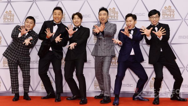 ‘무한도전’ 출연진들이 29일 서울 마포구 상암동 MBC 신사옥에서 열린 ‘2017 MBC 방송연예대상’ 레드카펫 행사에서 포즈를 취하고 있다.