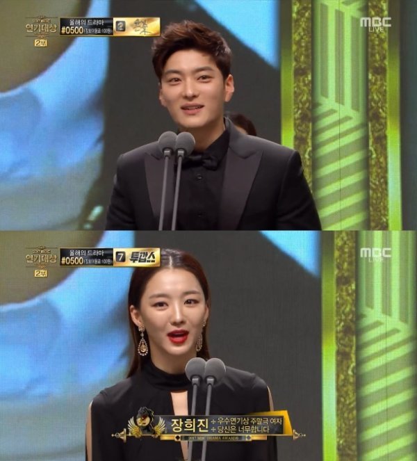 이날 ‘우수 연기상 주말극’에는 ‘돈꽃’ 장승조가 남자 부문, ‘당신은 너무합니다’ 장희진이 여자 부문 수상자로 호명됐다.