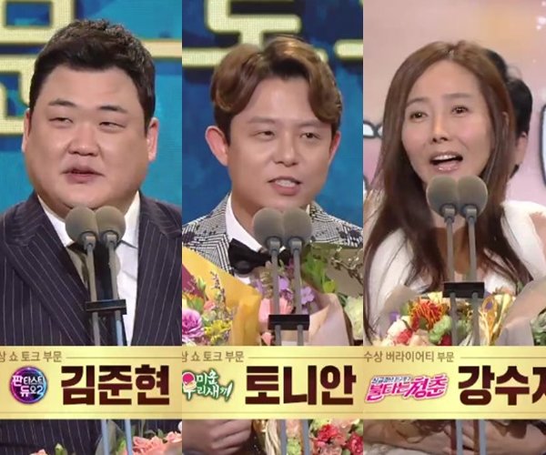 쇼토크 부문 우수상은 ‘판타스틱 듀오’ 김준현과 ‘미운우리새끼’ 토니안이 차지했다. 김준현은 “SBS 프로그램을 하고 있는데, 제일 좋아하는 걸 SBS에서 쭉 하는 것 같다. 먹고, 노래하는 걸 가장 좋아하는데 일로써 즐기면서 할 수 있어서 감사드리는 마음이다”라고 소감을 전했다. 토니안은 “진짜 예상치 못했다는 말이 무슨 말인지 알겠다. 오늘 받은 상은 과분한 상이라 생각한다. ‘미운우리새끼’ 제작진 여러분에 너무 감사드린다”고 말했다.