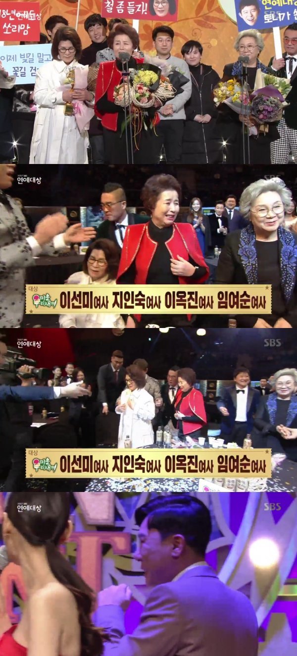 마지막으로 ‘미운우리새끼’ 모벤져스 이선미, 지인숙, 이옥진, 임여순 여사가 대상을 차지했다. 이상민의 어머니는 이날 시상식에 건강상의 이유로 불참했고, 이에 이상민은 호명과 동시에 감동의 눈물을 쏟아냈다.