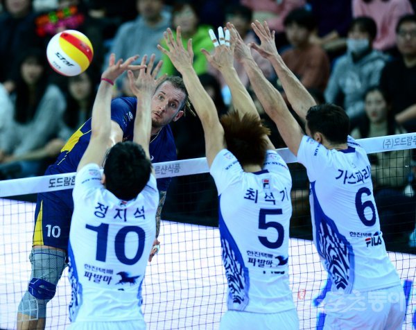 31일 인천 계양체육관에서 열린 ‘2017-18 도드람 V리그’ 남자부 한국전력과 대한항공 경기에서 한국전력 펠리페가 대한항공의 블로킹 사이로 스파이크 공격을 하고 있다.