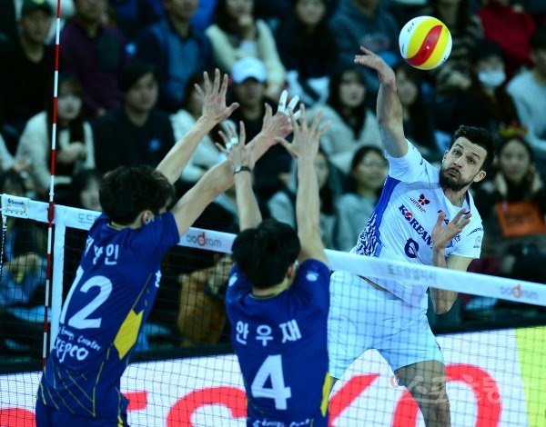 31일 인천 계양체육관에서 열린 ‘2017-18 도드람 V리그’ 남자부 한국전력과 대한항공 경기에서 대한항공 가스파리니가 한국전력의 블로킹 사이로 스파이크 공격을 하고 있다.