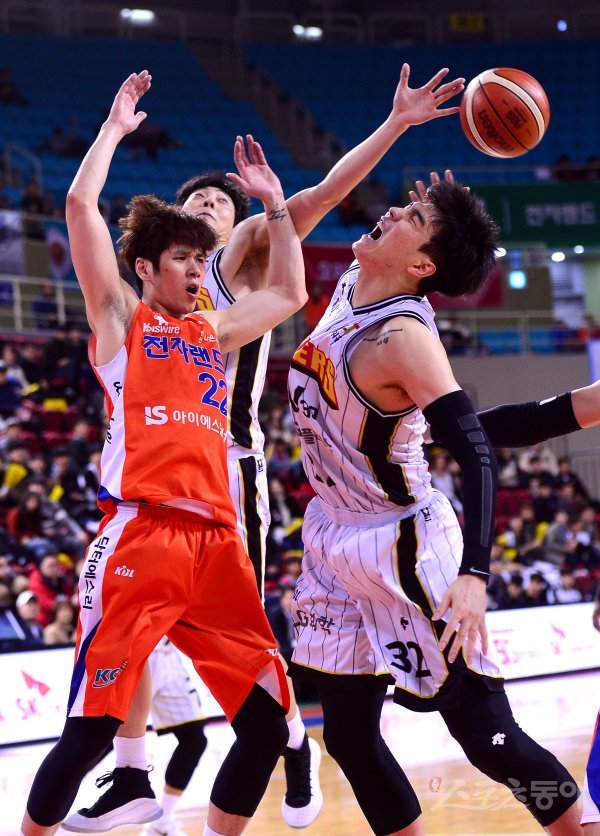 31일 인천삼산월드체육관에서 열린 ‘2017-2018 정관장 프로농구’ 인천 전자랜드와 창원 LG 경기에서 전자랜드 김상규와 LG 김종규가 리바운드 볼을 다투고 있다.
