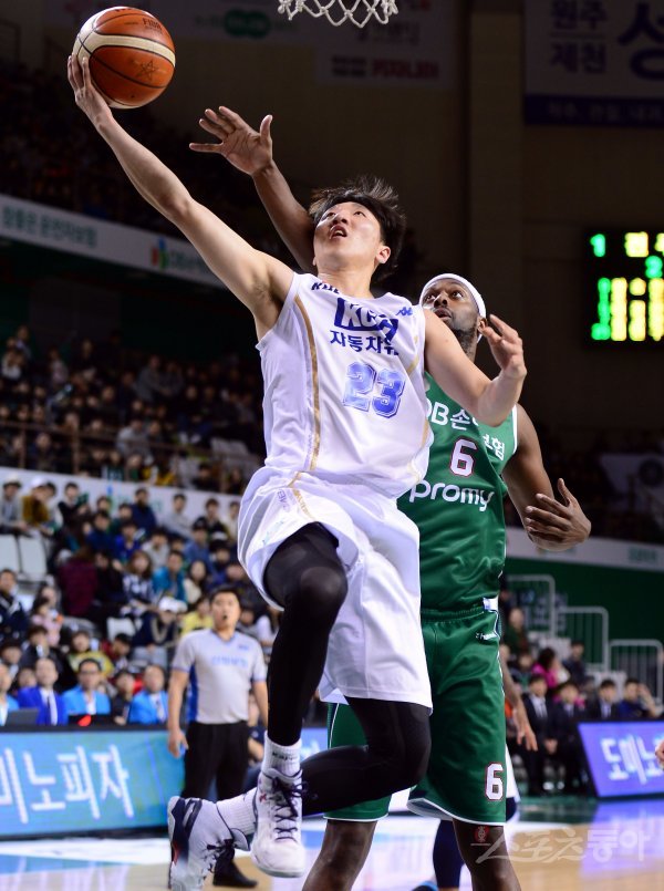 1일 원주 치악체육관에서 열린 ‘2017-2018 정관장 프로농구’ 원주 DB와 전주 KCC의 경기에서 KCC 김민구가 DB 로드의 수비를 피해 슛을 쏘고 있다.
