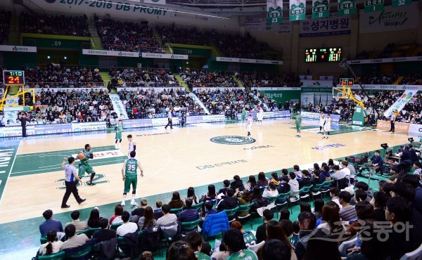 1일 원주 치악체육관에서 열린 ‘2017-2018 정관장 프로농구’ 원주 DB와 전주 KCC의 경기에서 새해를 맞이해 만원 관중이 들어차 경기를 즐기고 있다.