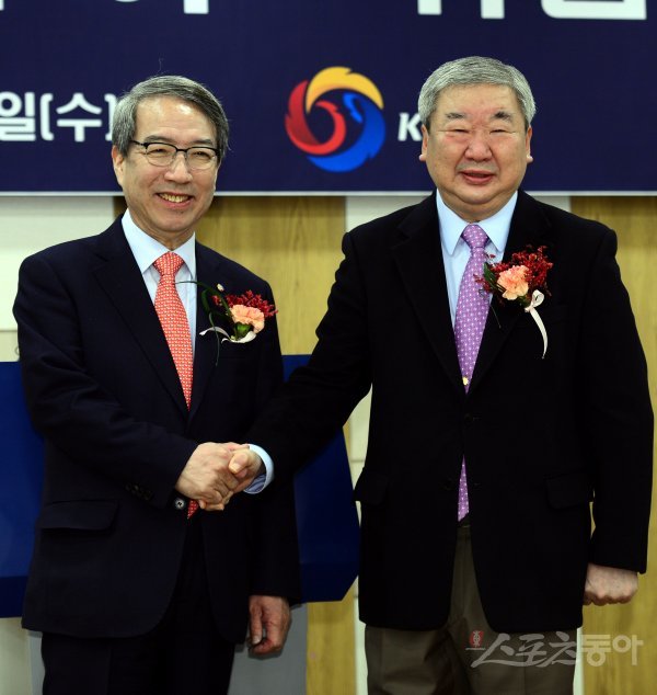 3일 서울 캠코 양재타워에서 ‘KBO 총재 이-취임식’이 열렸다. 정운찬 신임 KBO 총재와 구본능 전 총재가 악수를 나누고 있다.