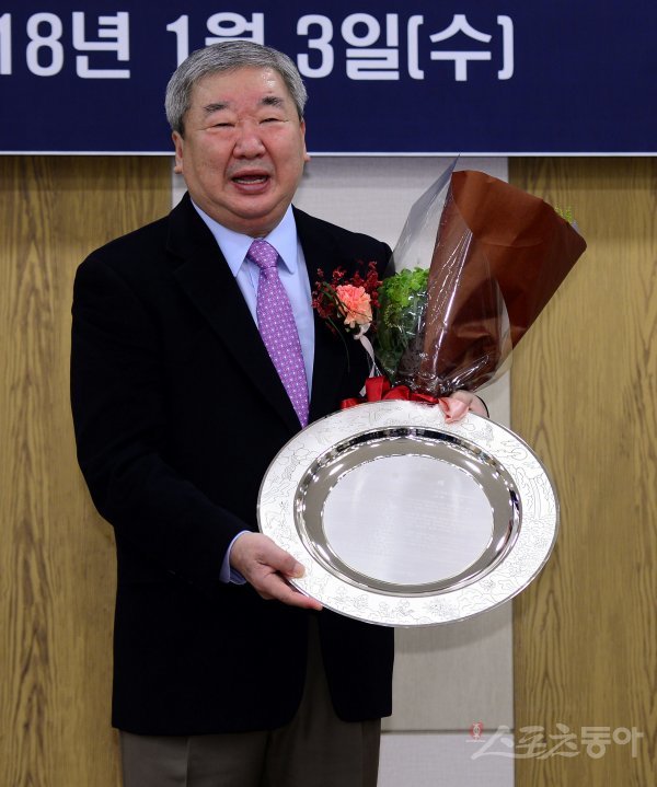 3일 서울 캠코 양재타워에서 ‘KBO 총재 이-취임식’이 열렸다. 구본능 전 KBO 총재가 공로패를 받은 뒤 기념촬영을 하고 있다.