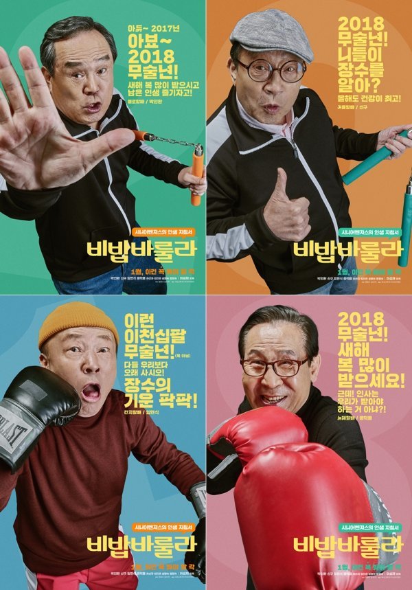 박인환, 신구, 임현식, 윤덕용 등 대한민국을 대표하는 명품 국민 배우들이 선보이는 새해 첫 휴먼 코미디 ‘비밥바룰라’가 2018년 새해를 맞이해 무술년 캐릭터 포스터를 공개해 뜨거운 반향을 일으키고 있다.