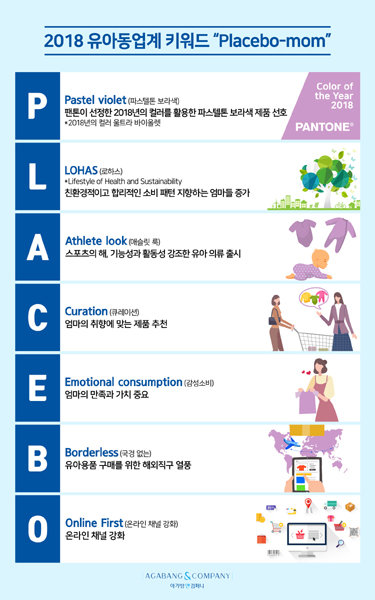 아가방앤컴퍼니가 2018년 무술년 유아동업계 키워드로 ‘플라시보 맘(Placebo-mom)’을 선정했다. 소비로 얻는 심리적·정서적 만족감인 ‘가심비’를 뜻함과 동시에 올해 유아동 업계의 트렌드인 ‘파스텔톤 보라색’, ‘로하스’, ‘애슬릿 룩’, ‘큐레이션 쇼핑’, ‘감성소비’, ‘국경 없는’, ‘온라인 채널 강화’에 앞글자를 딴 것이다.