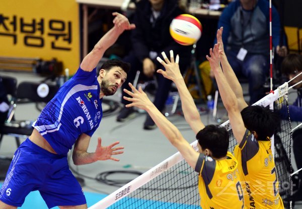 3일 경기도 의정부체육관에서 ‘2017-2018 도드람 V리그’ 의정부 KB손해보험과 인천 대한항공의 경기가 열렸다. 대한항공 가스파리니가 KB손해보험 블로커를 피해 스파이크를 날리고 있다.