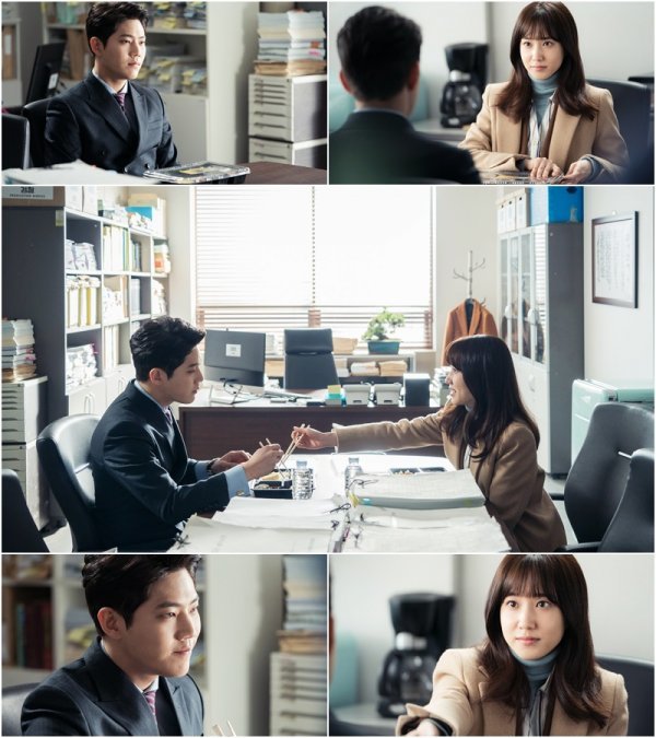 이와 관련 3일(오늘) 방송분에서는 박은빈과 동하가 마주보고 앉은 채로 단둘이 도시락을 먹고 있는 모습이 포착돼 시선을 집중시키고 있다. 극중 이정주(박은빈)가 도한준(동하)의 검사 사무실로 도시락을 준비해와 함께 식사를 하고 있는 장면. 이정주는 도한준이 좋아하는 계란말이를 밥 위에 놔주는 등 활짝 웃고 있는 반면, 도한준은 근심이 가득한 표정 속에 옅은 미소를 짓고 있다. ‘김가영 살인사건’으로 인해 복잡다단하게 엮인 이정주와 도한준이 갑자기 둘만의 ‘도시락 오찬’을 하게 된 이유는 무엇인지, 두 사람의 관계는 어떻게 될 지 궁금증이 모아지고 있다.
