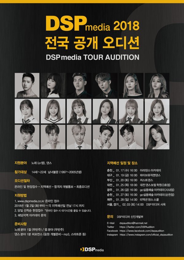 한편, DSP미디어가 주관하는 2018 전국 공개 오디션에 관한 자세한 내용은 DSP미디어 공식 홈페이지에서 확인할 수 있다.